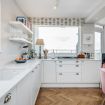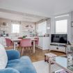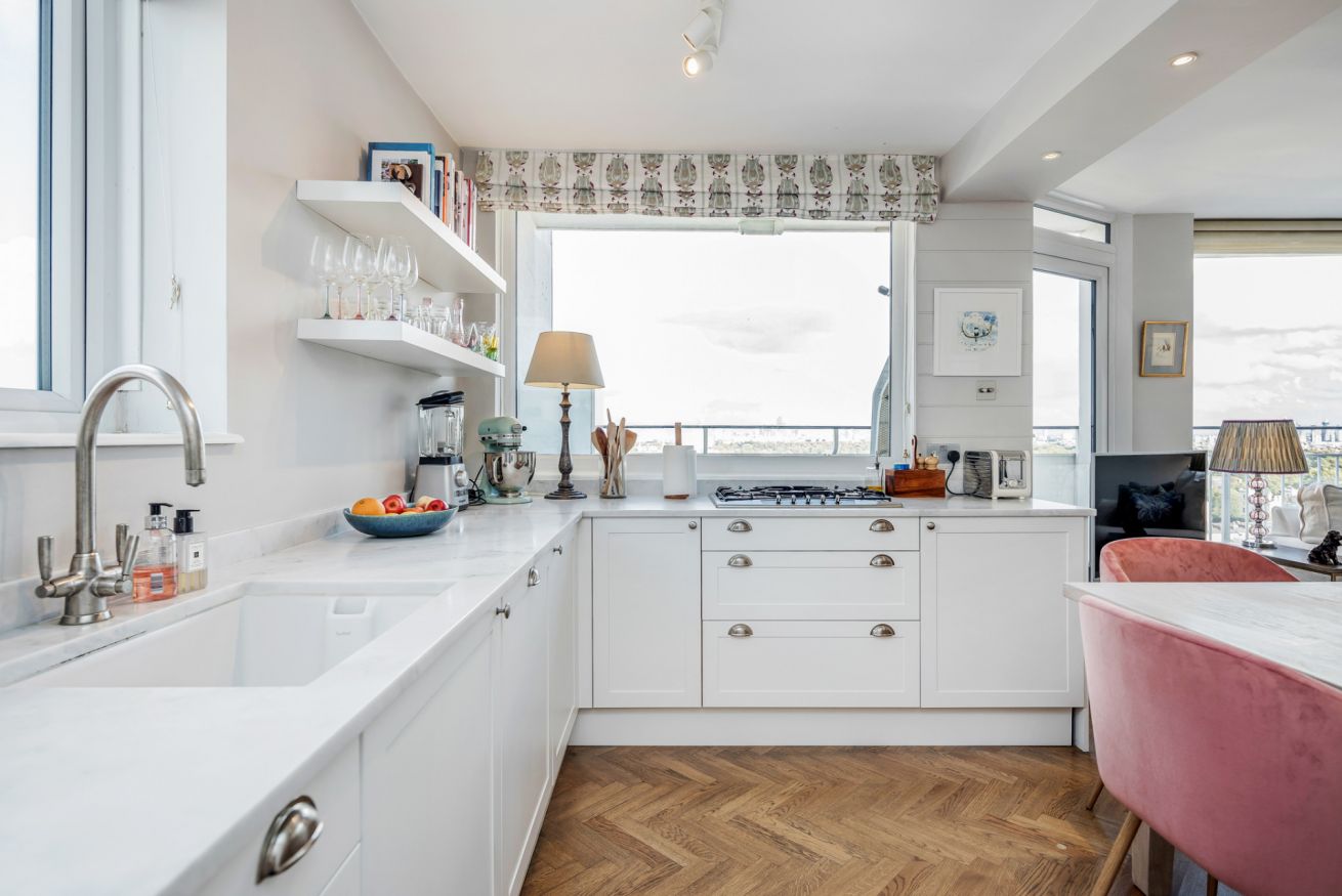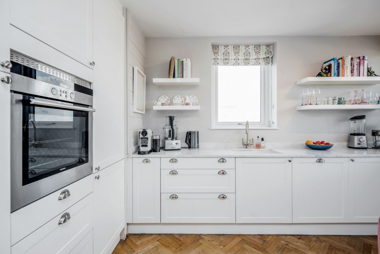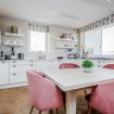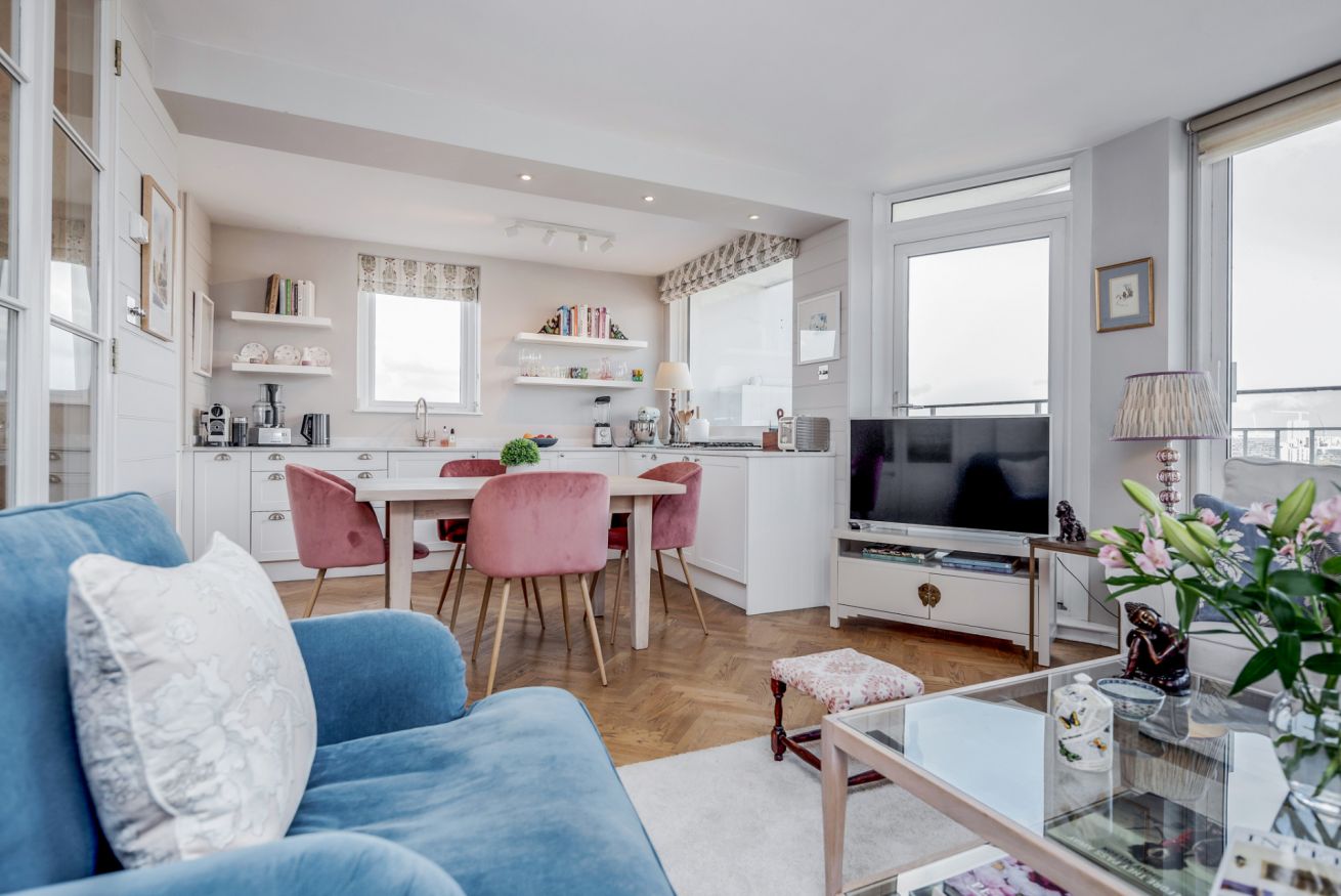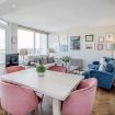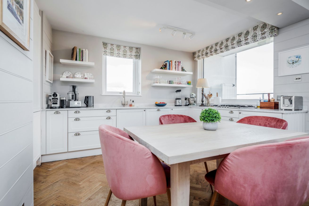 The modern kitchen is fully-equipped and includes: a Nespresso Machine, a cafetiere, a coffee Machine, a fridge/freezer, a microwave, a kettle, a toaster, a dishwasher, an oven and gas hobs. The adjacent dining area is furnished with a beautiful wooden dining table and 4 pink velvet dining chairs.