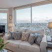 The seating area is warm & inviting, adorned with stylish furnishings including a comfy sofa, 2 plush velvet armchairs, a coffee table and a flat-screen TV. The area leads out onto the private balcony, boasting stunning panoramic views of the city.