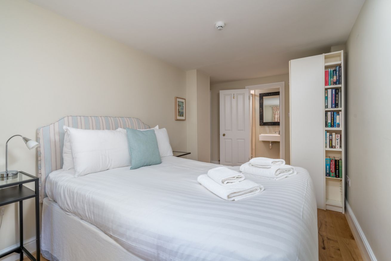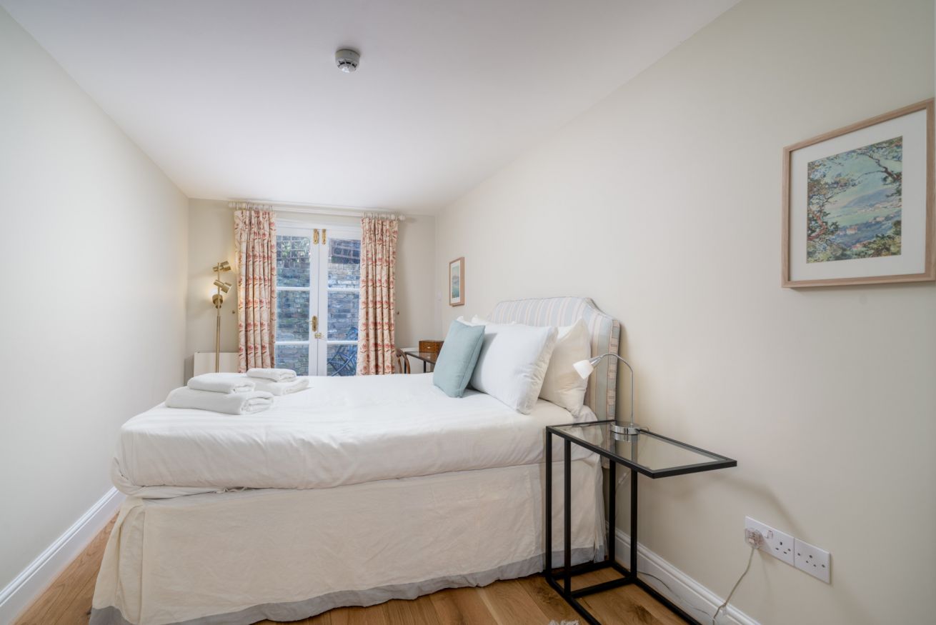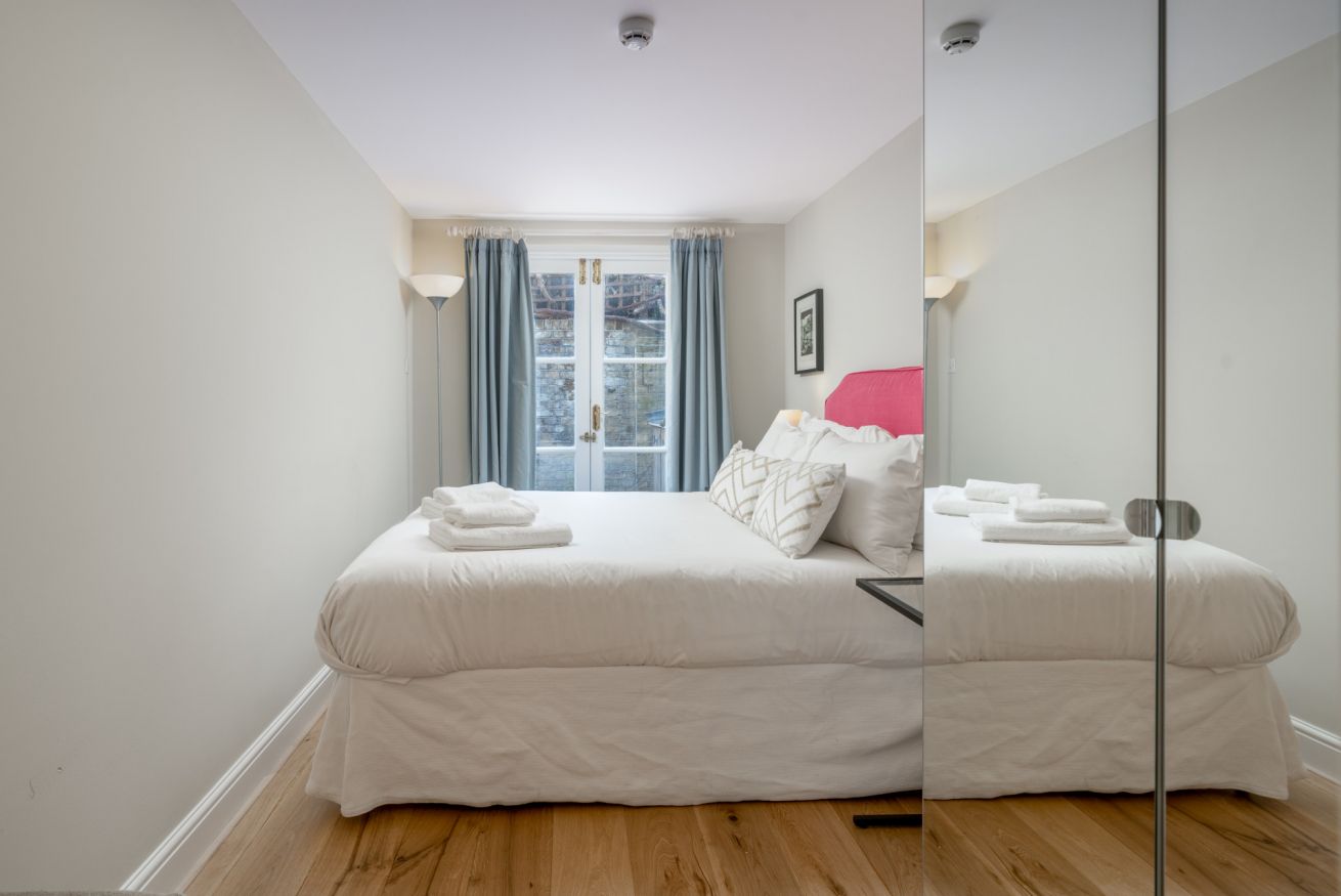 — The bedrooms are situated in the basement equipped with and both bedrooms look over a garden